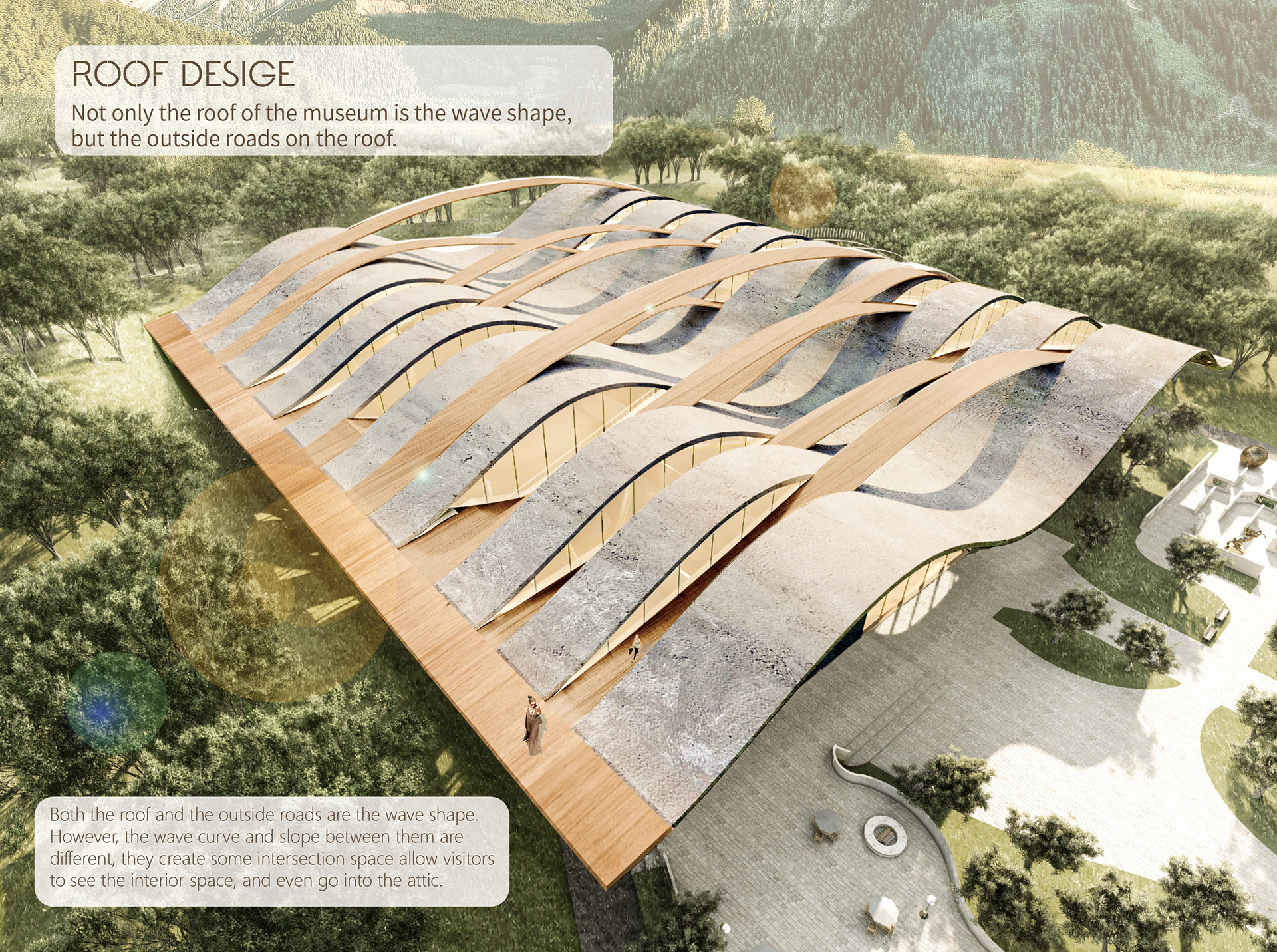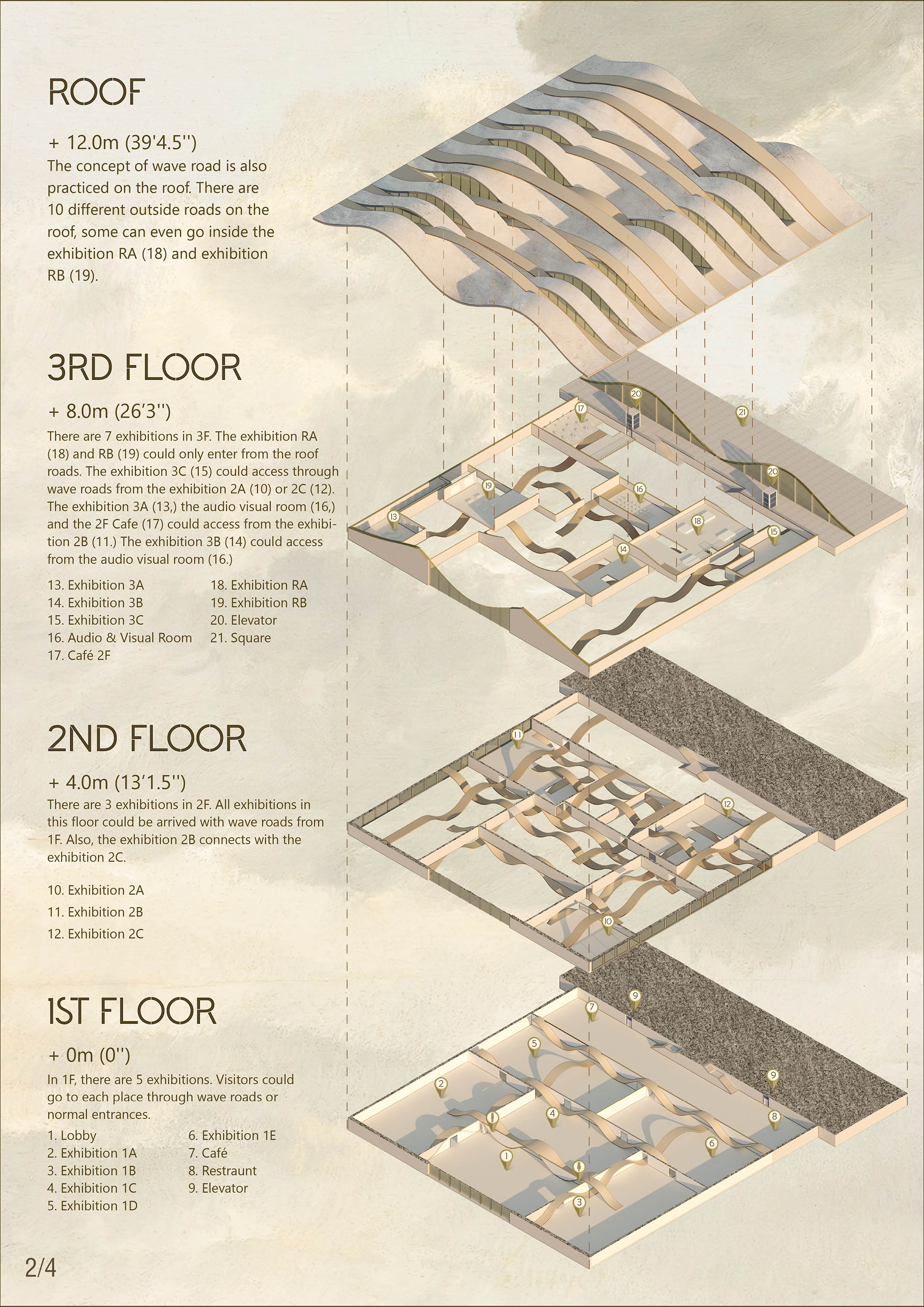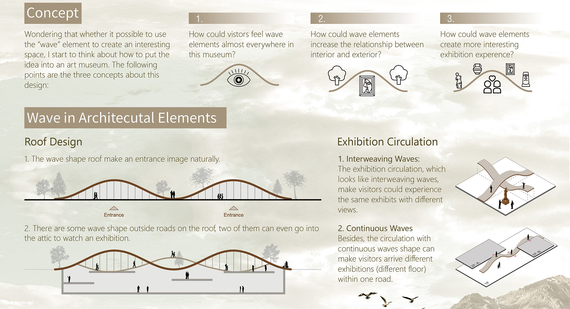Wondering whether it is possible to use the “wave” element to create an interesting space, I start to think about how to put the idea into an art museum. There are three aims in this design. First, let visitors feel wave elements almost everywhere in this museum. Second, use wave elements to increase the relationship between interior and exterior. Third, create a more interesting exhibition experience through wave elements.